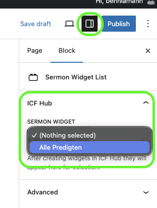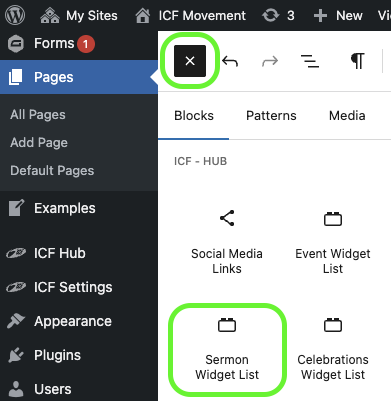 In the content elements (blocks), go to “ICF – Hub” and select “Sermon Widget List”.