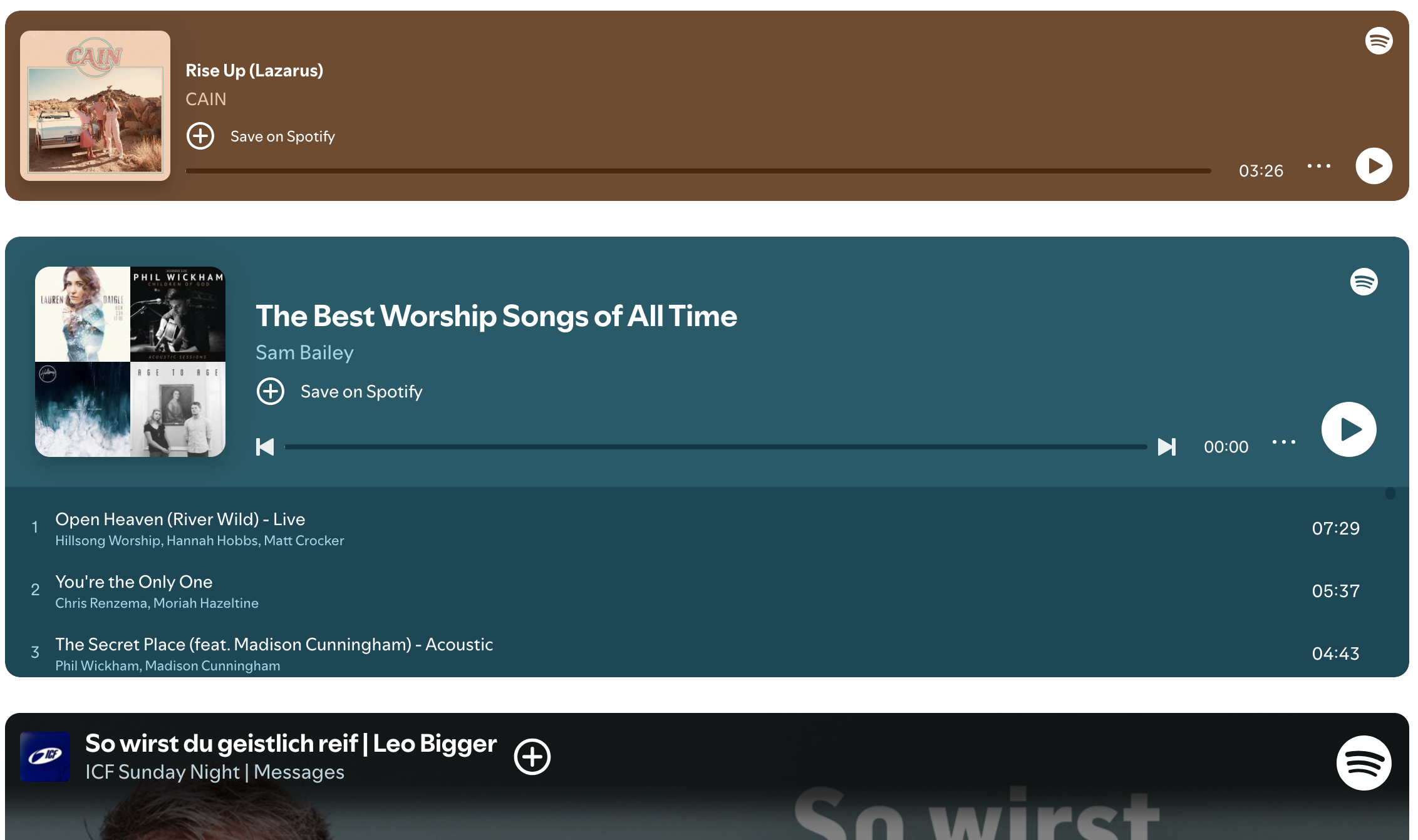 You can embed different Spotify elements too: Songs, Playlists, or Podcasts.