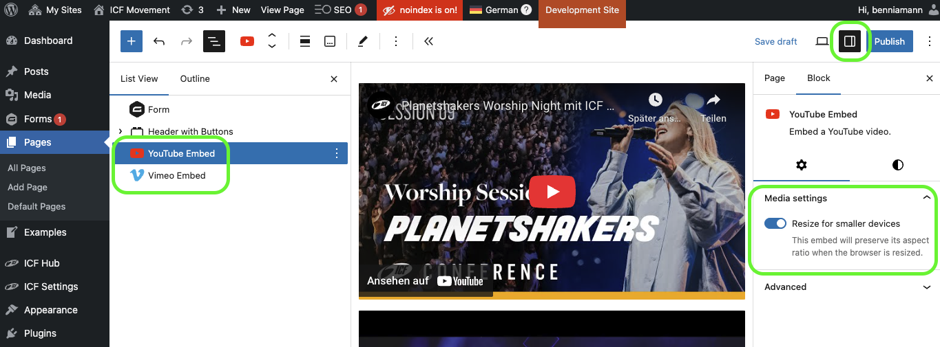 Don't forget: When you click on the respective YouTube or Vimeo element and activate the sidebar (see screenshot), additional settings will open.