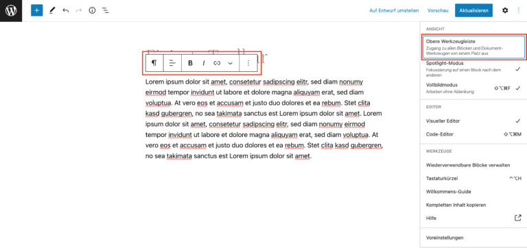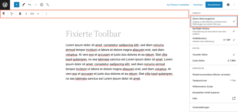 When you edit a block, a toolbar appears above the block by default. On the one hand, this is practical because it clearly shows which block is being edited. On the other hand, however, the toolbar covers part of your block view. In the general settings, you have the option of anchoring the bar permanently to the top of the editor. For illustration purposes, the editor with the toolbar directly above the block.