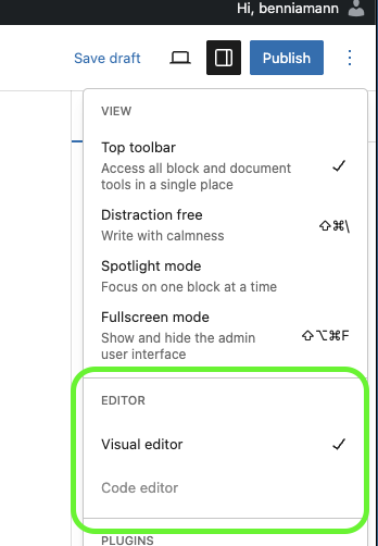 As with the old website, we have integrated a code editor. If you activate the sidebar in the editor, you can switch between Visual Editor and Code Editor.
