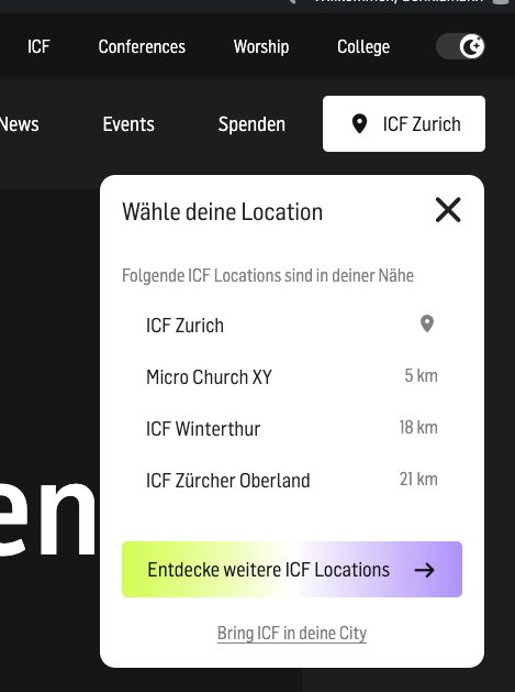 The website detects your current location and first suggests ICF’s or Micro Churches that belong to your home ICF. After that, it shows nearby ICF’s (with distance in kilometers).
